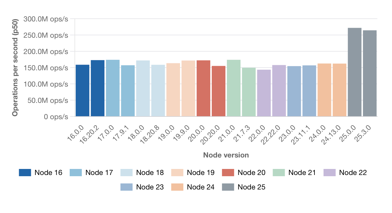 Node.js performance continues to improve steadily across releases, but Node 25 stands out, particularly for numeric and loop-heavy workloads.