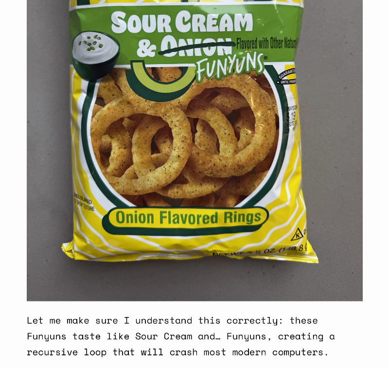 The Snacks & Cereals of 2025 I have zero interest in US chips and snacks, I prefer to spend my caloric intake on other delights, but I totally enjoyed reading this blog post. A delightful review of what sold on supermarket shelves last year. Delightful and funny.