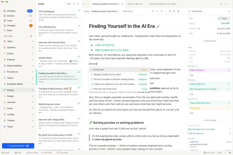 Tolaria I just added this app this to my repertoire. I didn't get a chance to use it much yet, but it looks interesting — build a knowledge you can share with your AI that's version controlled and doesn't require an Office 356 license. Tagline: "Organize your notes as Markdown files. With native relationships, Git, and Claude Code integration" (also Codex)