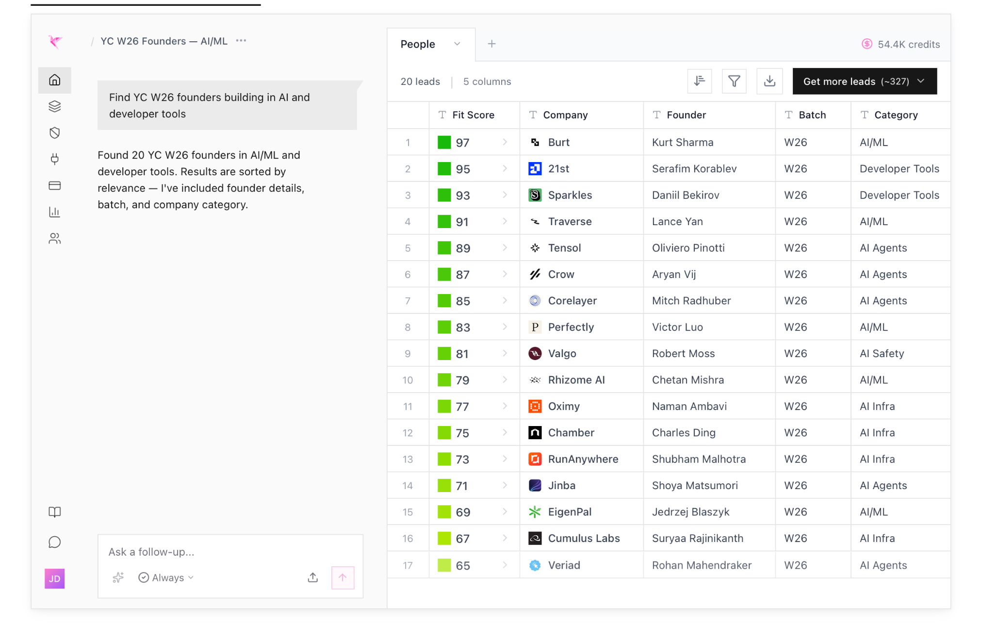 Origami Chatbot that helps sales teams find prospects, enrich contact info, and build lead lists using natural language. Describe your ideal customer and it will search through 15+ data sources (LinkedIn, Shopify, WooCommerce, etc) for you. Starting at $80/month for 500~1,000 fully enriched prospects
