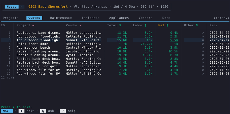 Micasa Tracks maintenance, projects, incidents, appliances, vendors, quotes, and documents—all from your terminal.