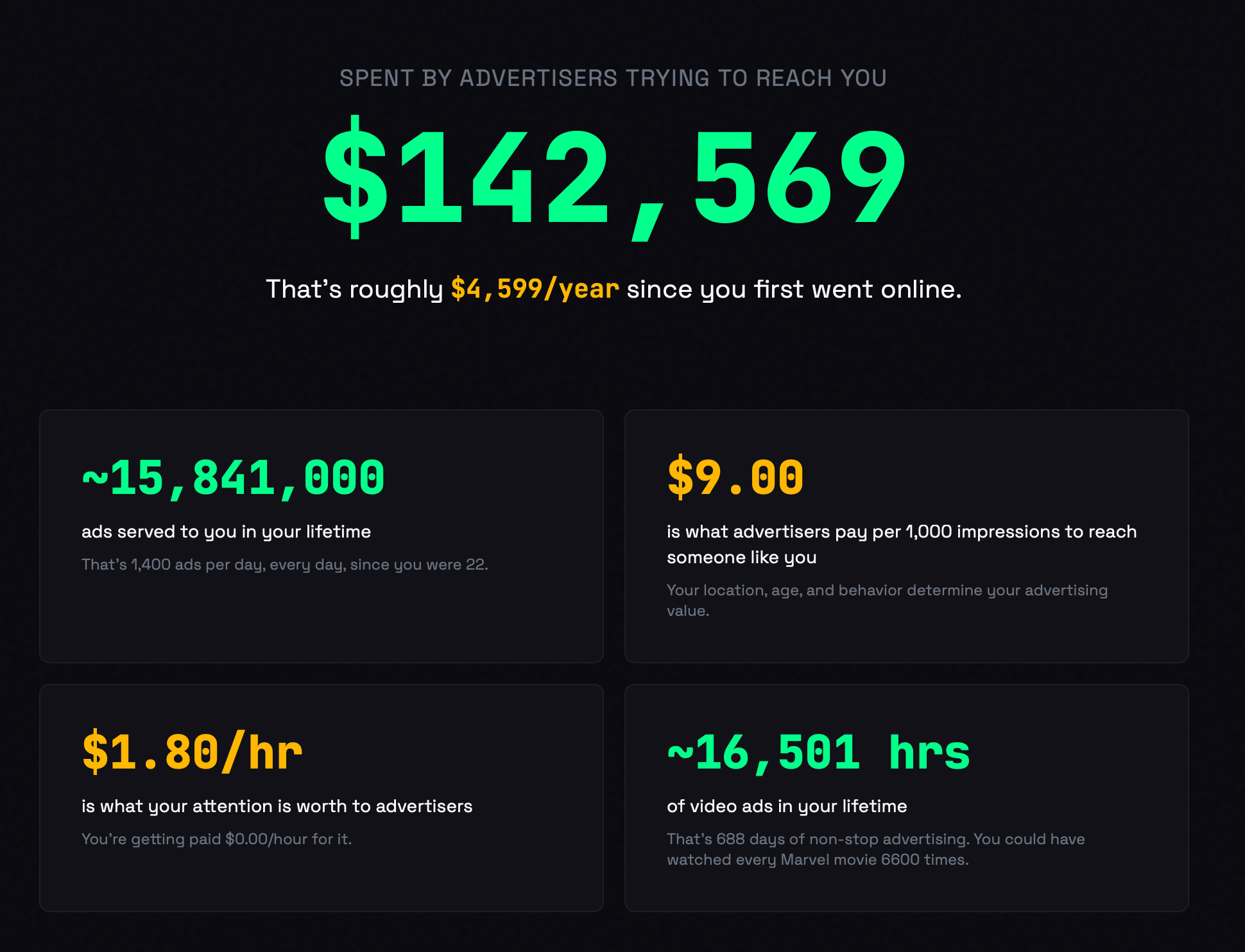 The advertising industry has spent $_______ on you. I'm worth $142,569! Ok, not exactly worth, more like this is how much advertisers may have spent on my eyeballs. What's your worth?