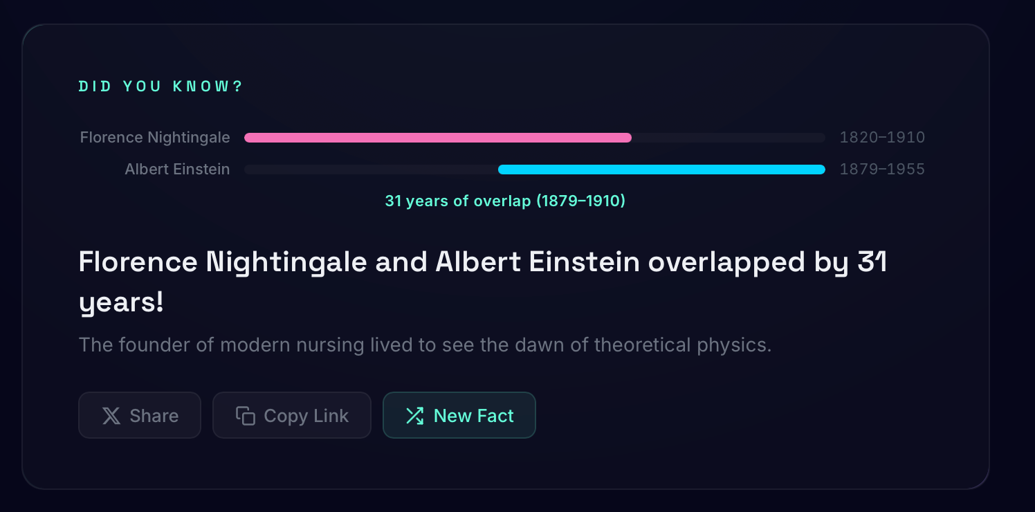 Timeliner "Did you know …" Explore the connections that shaped history with this delightful timeline. Also, did you know this site was "Vibe-coded with Claude Opus 4.6"?