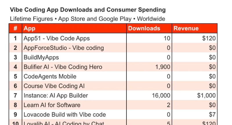 The largest of these is Instance: AI App Builder, which has seen only 16,000 downloads and $1,000 in consumer spending. The next largest app, Vibe Studio, has pulled in just 4,000 downloads but has made no money.