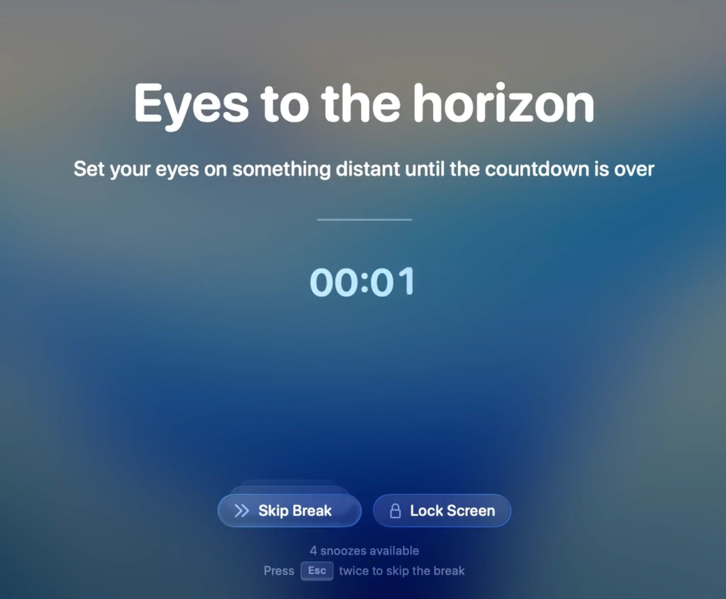 LookAway This is one app I have to run on my Mac. It forces me to take a break every 45 minutes — not a Pomodoro break (which I never got the hang off), but a short 30 second break to look away from the screen and give my eyes a much deserved rest. It also gives minor nudges to blink and to stretch the neck, all of which help me feel more relaxed and energized during the workday, otherwise I could get lost in Claude for 8 hours straight. And it syncs with my iPhone so I can't swap devices to "just check social media" while taking a break. Love it.