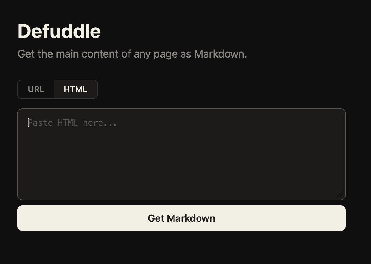 Defuddle When you need the content of a page as Markdown. Originally created for Obsidian, and MIT-licensed so you can self-host it or integrate with your codebase.