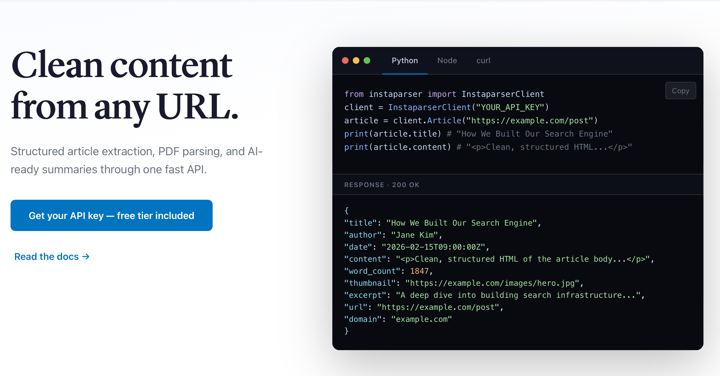 Instaparser Another option for cleaning up HTML, this one from Instapaper, and it can tackle PDFs and generate article summaries. 1,000 free credit/month which I believe is enough for non-commercial use cases.