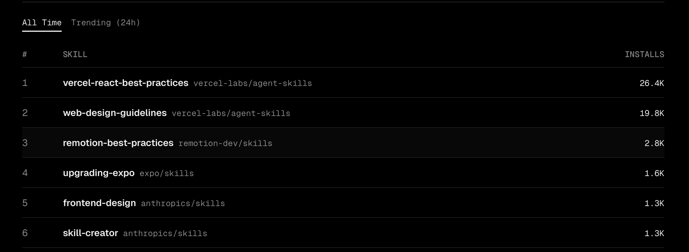 The leaderboard of skills Install any skill with npx skills add <owner/repo> (I think that for most use cases a skill is better than MCP)