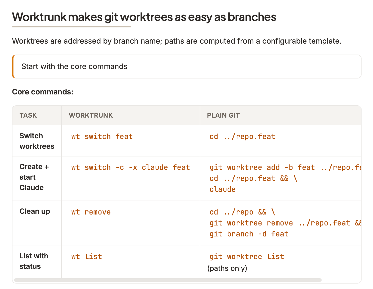 worktrunk Doesn't do a lot which is the point — makes it easier to work with Git worktrees.